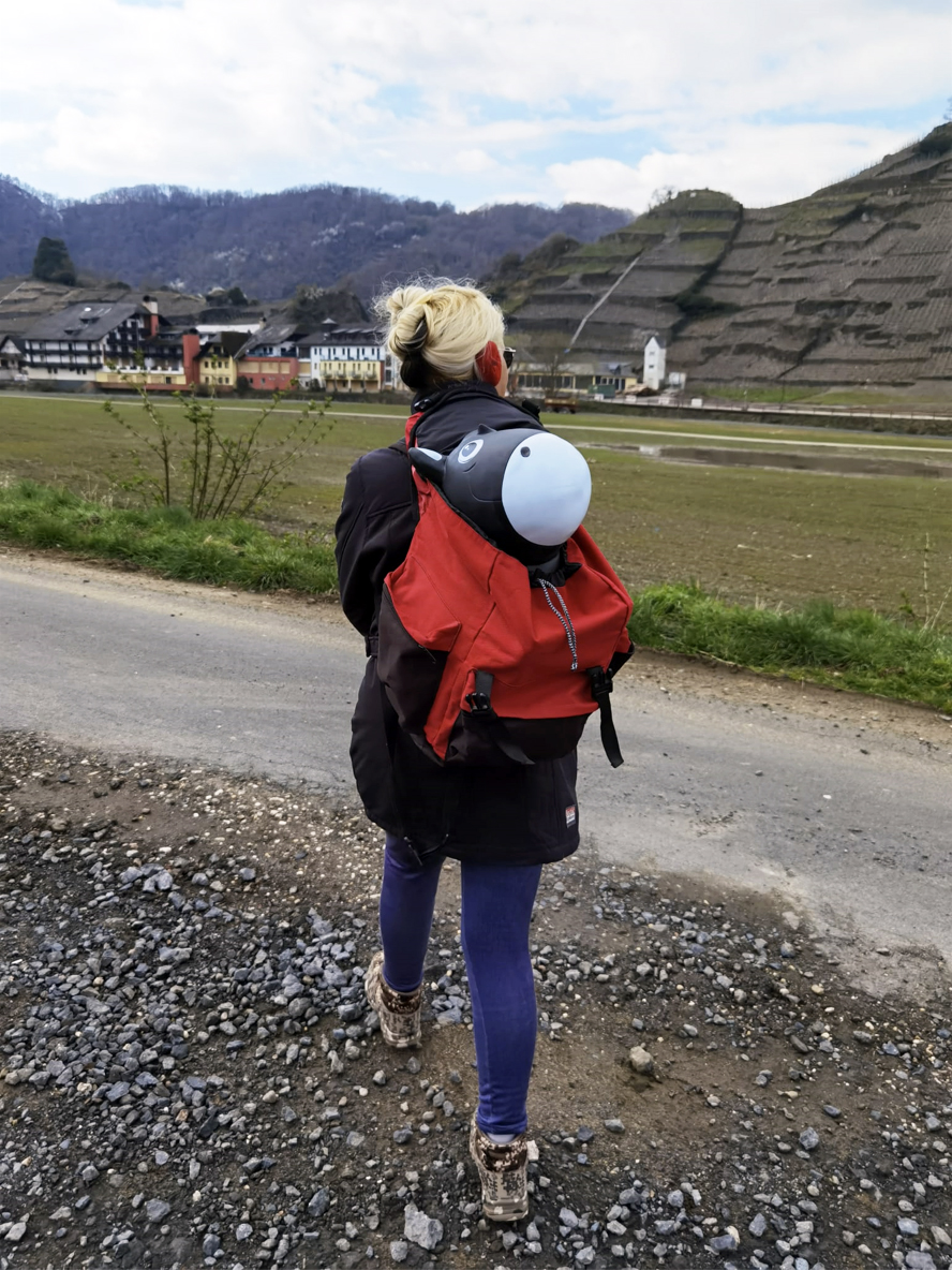 Wir parken auf dem Parkplatz unterhalb der Burg Saffenburg in Mayschoß und machen uns auf den Weg immer bergauf Richtung Burg. Ich freue mich riesig, zumal ich nicht mal laufen muss. Ich werde im Rucksack bis auf die Burgruine Saffenburg getragen. Unterwegs kommen uns ein paar Menschen entgegen, die mich ganz merkwürdig angucken. Ob die wohl ein Problem mit mir haben? Egal, ich sitze im warmen Rucksack und geniesse die tolle Umgebung, mitten in den Weinbergen. Endlich oben angekommen ist meine Familie ganz schön aus der Puste. Aber es hat sich gelohnt. Ui, was für ein sagenhafter Ausblick auf den Weinort Mayschoß, die Ahr und die tollen Berge.